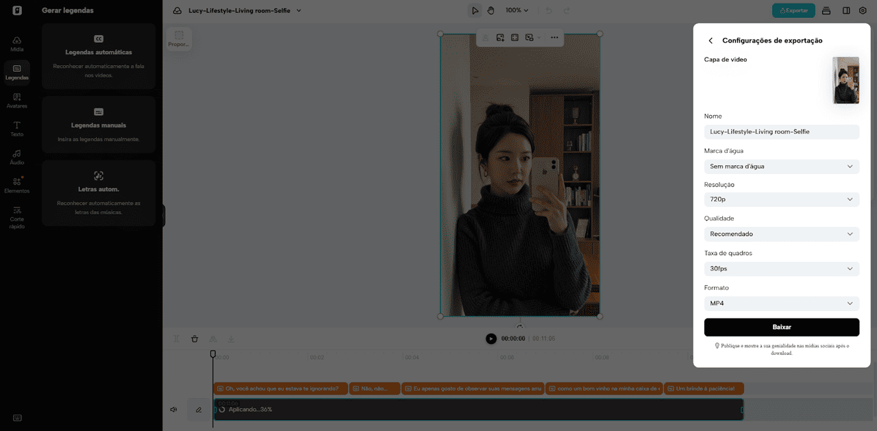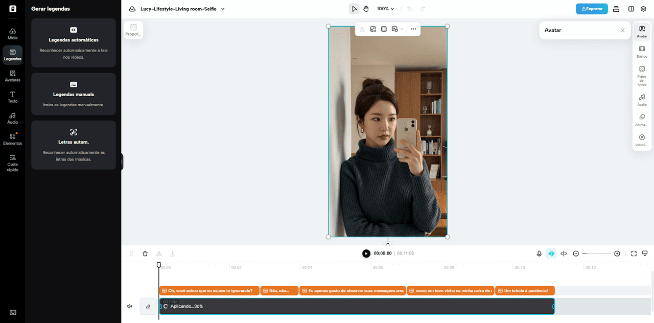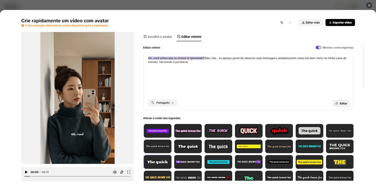 Toque em “Editar roteiro” e digite o conteúdo que antes você precisava gravar manualmente. O avatar realiza a sincronização labial com precisão, sem a necessidade de equipamentos extras. Para melhorar a clareza, acesse “Alterar estilo da legenda” e escolha um tema de legendas que facilite a comunicação.