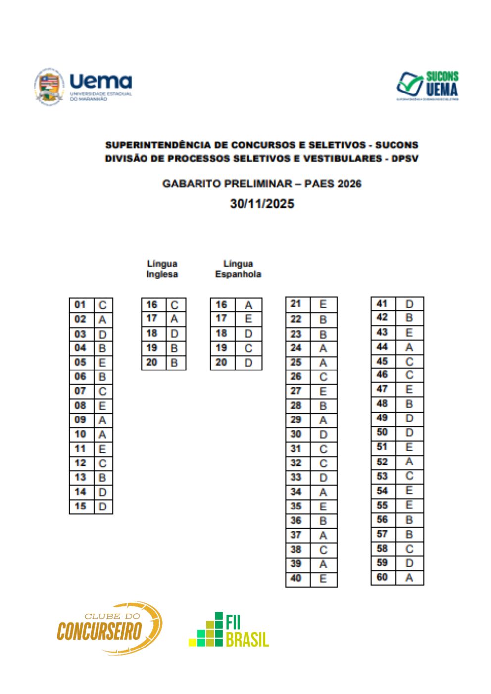 O gabarito preliminar será publicado nesta página assim que for disponibilizado oficialmente pela banca examinadora DPSV/SUCONS/UEMA. Recomendamos que os candidatos atualizem a página constantemente para conferir em primeira mão a resposta esperada.